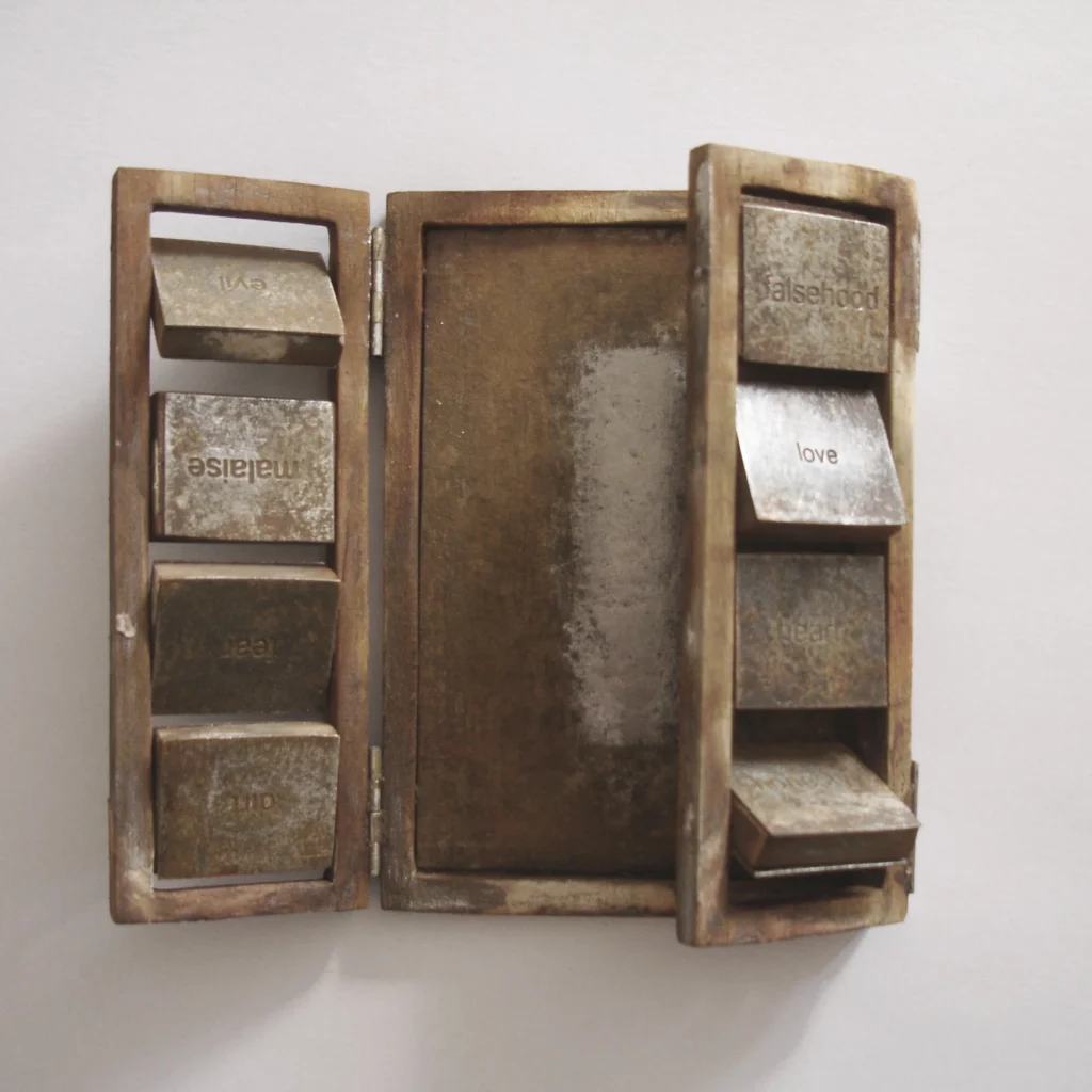 A. Majewska WOLNOŚĆ WYBORU, 2013 r. , obiekt (drewno, blachaz grawerem), wymiary 120 x 160 x 16 mm