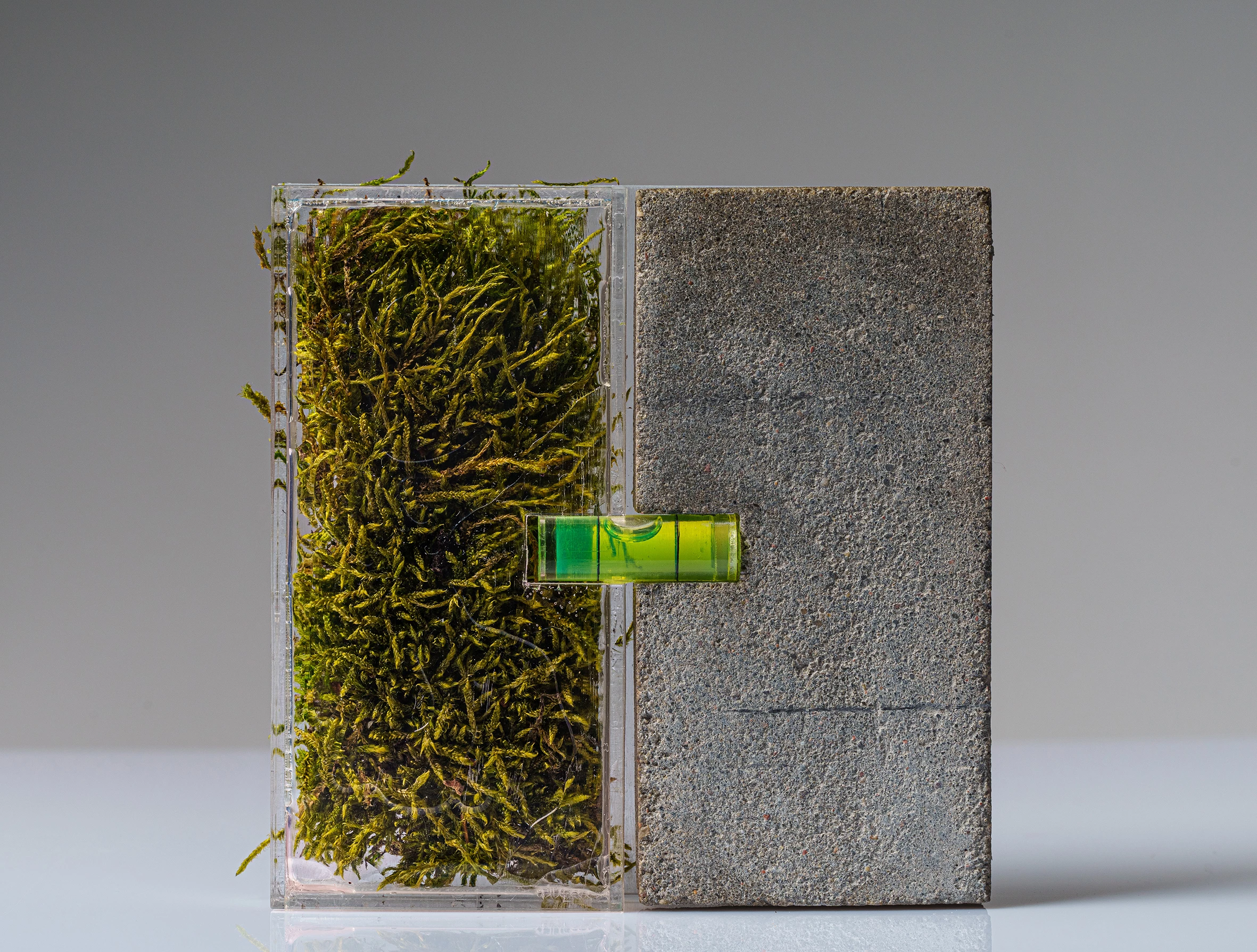 A. Majewska, RÓWNOWAGA, 2022 r., obiekt, wymiary 100x110x15 mm, materiał beton, mech, pleksi, libella
