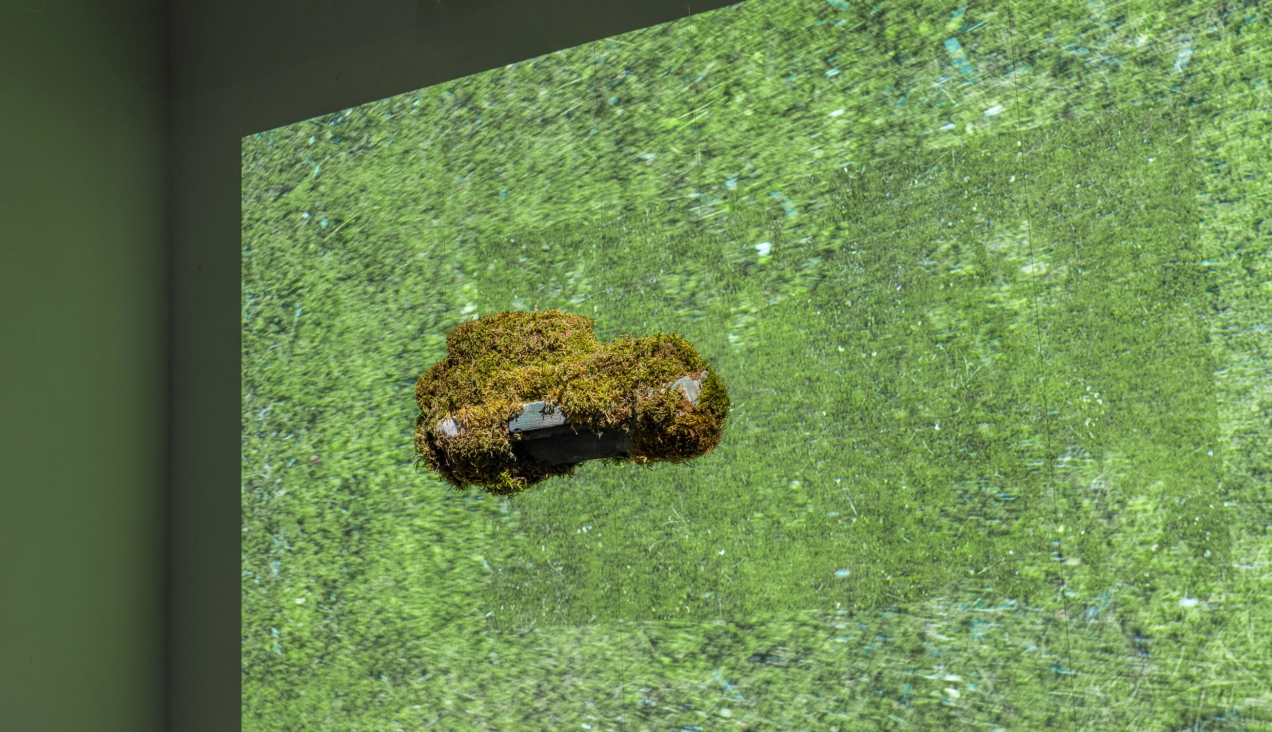 A. Majewska z wystawy HORYZONT, praca NIE-OBECNOŚĆ -ANEKSJA , obiekt z mchu w komtekście obrazu – animacji