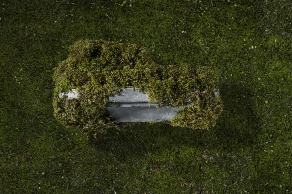 A. Majewska, NIE-OBECNOŚĆ -ANEKSJA, obiekt w kontekście filmu, wymiary 50x25x30 cm, materiał mech i zaprawa cementowa