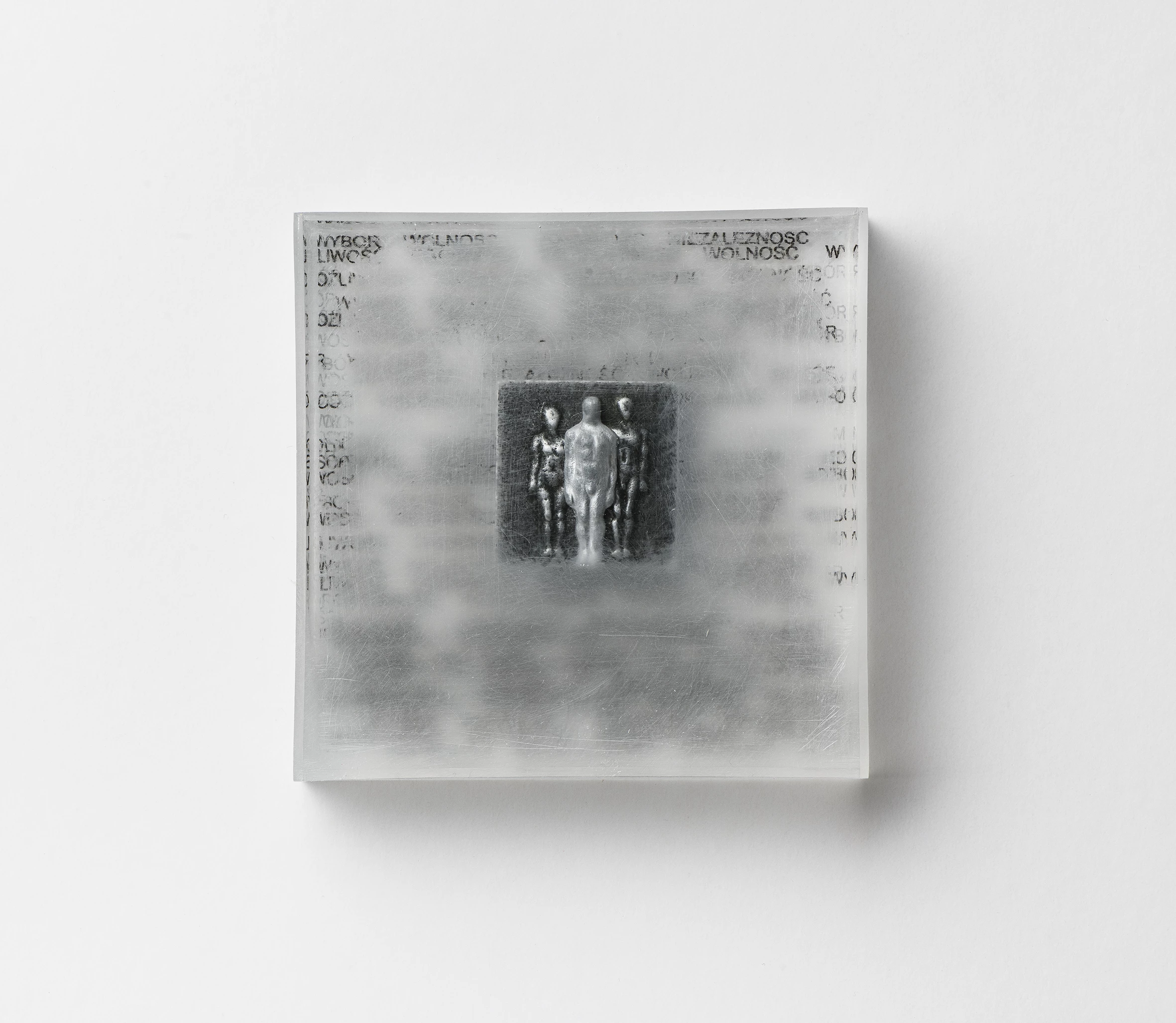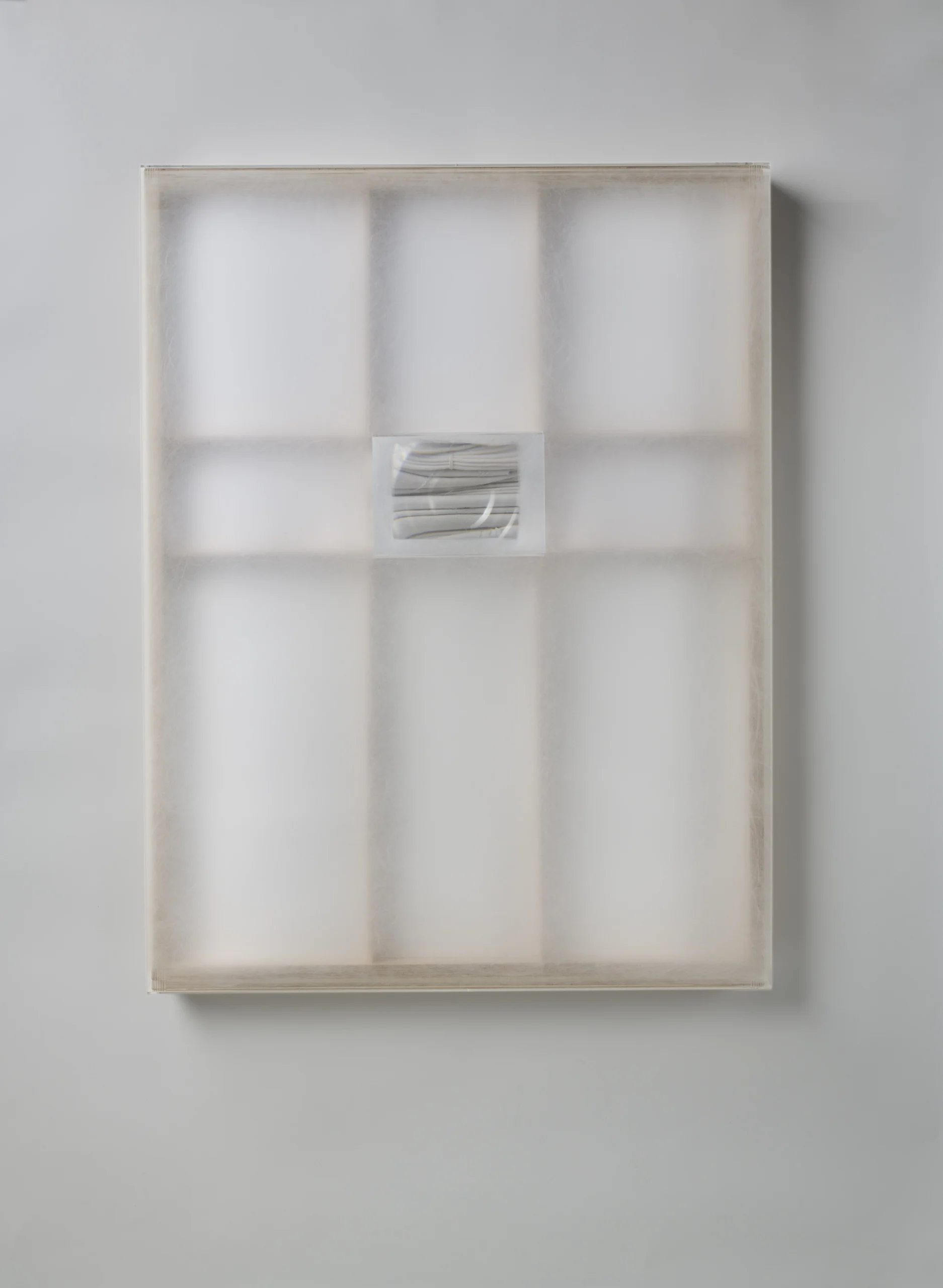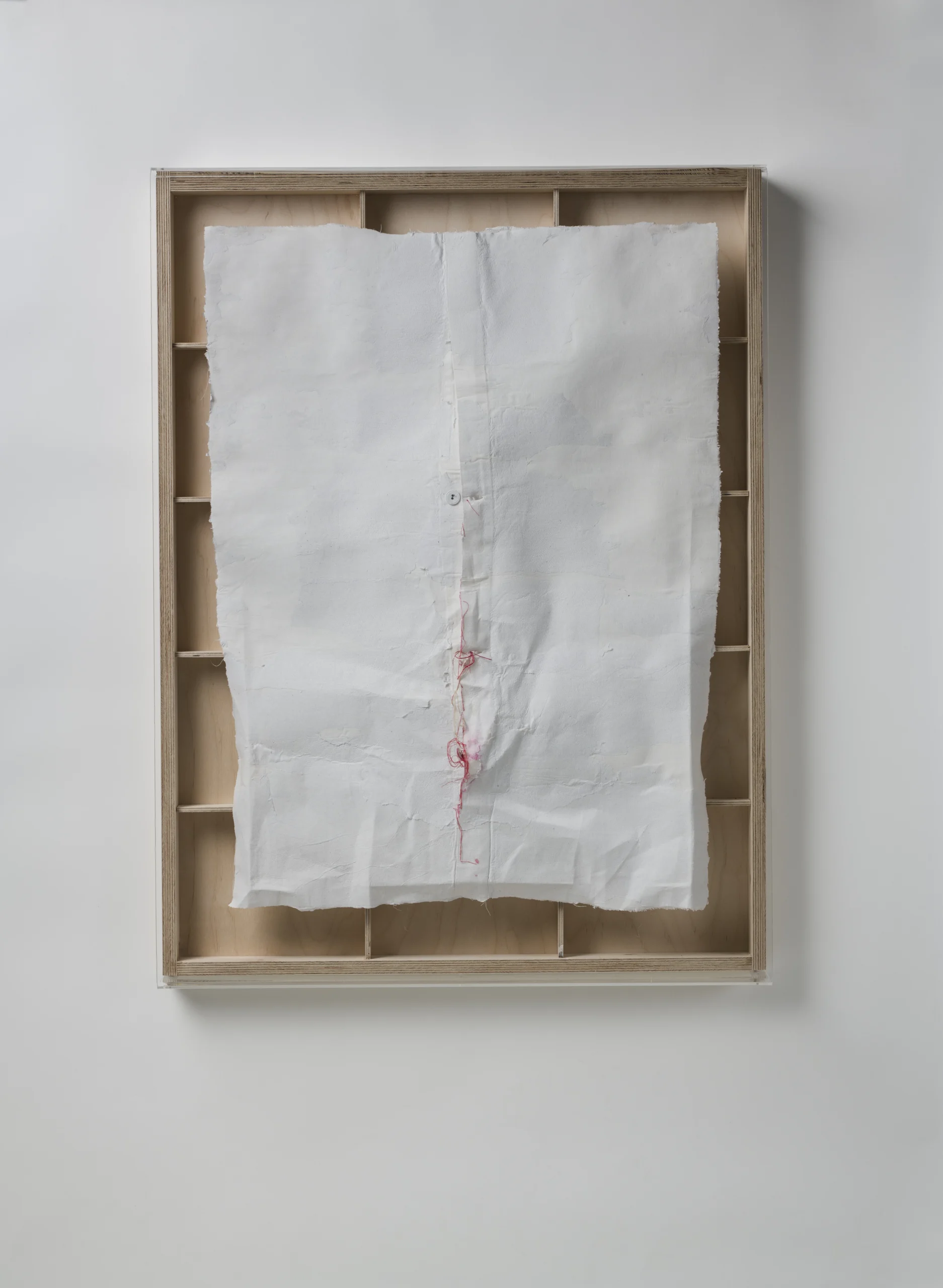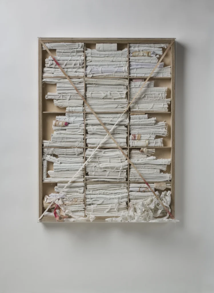 Niepamięć 2, 2022, materiał płótno, bandaż, sklejka, pleksi, wymiary 98,5 x 75 x 14 cm