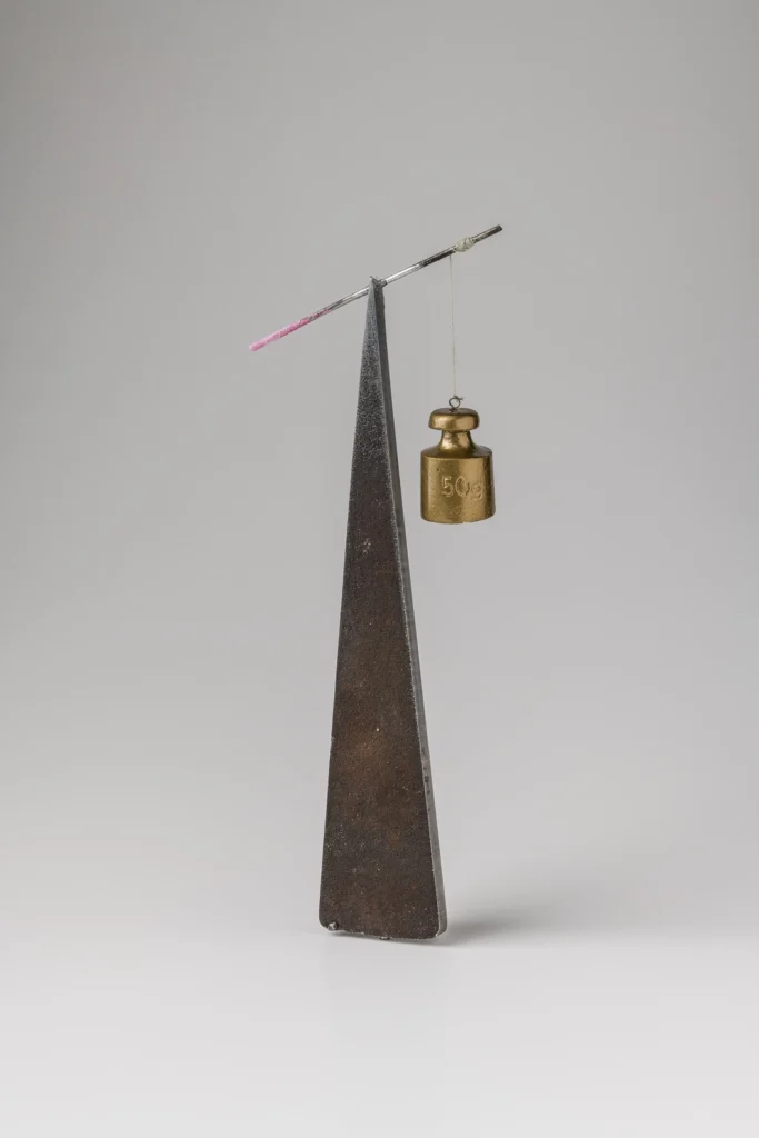 A. Majewska, WIARA, 2018 r., obiekt, materiał (stalowy klin, odważnik, pręt) wys. 170 mm