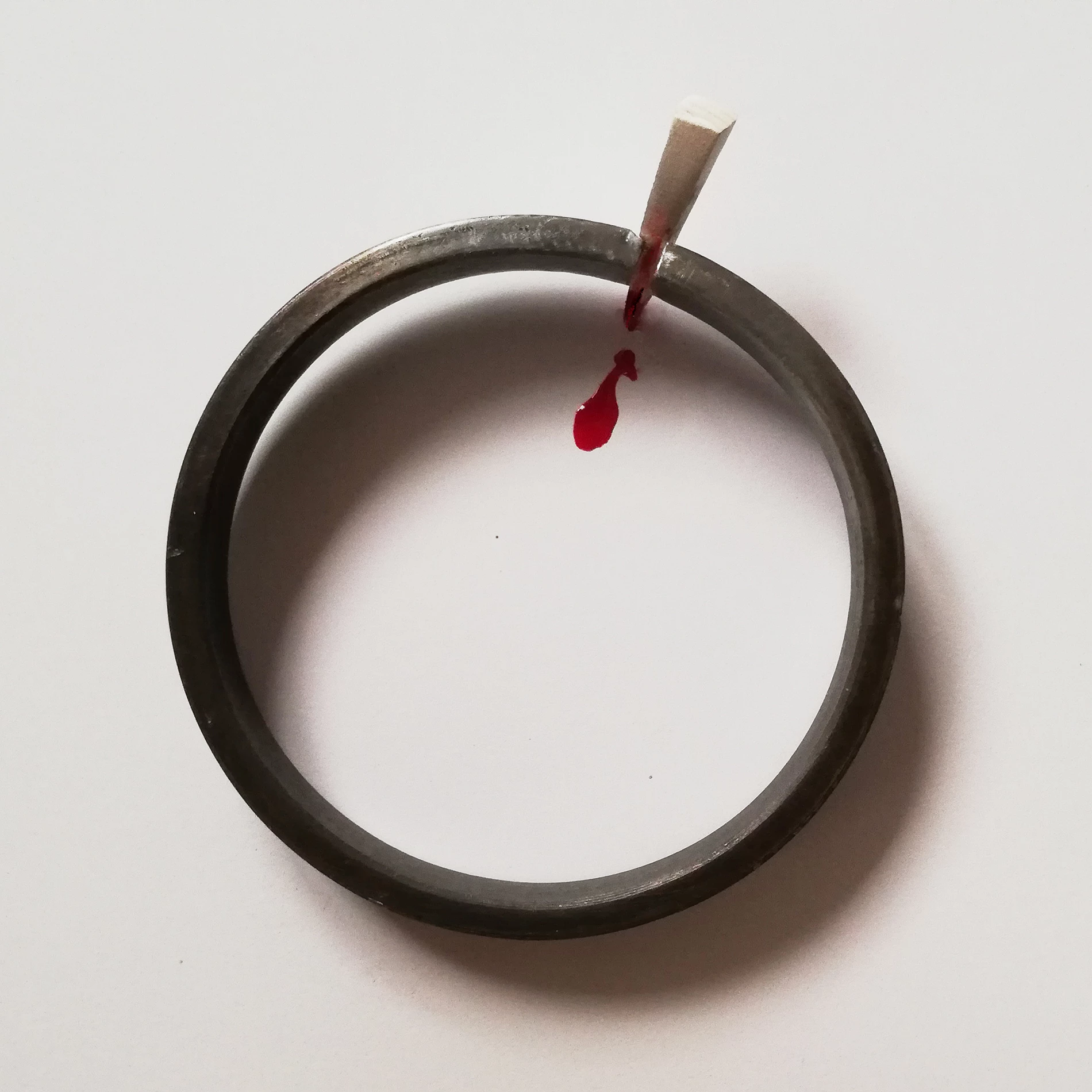 A. Majewska, GRANICA, 2021 R., obiekt (obręcz stalowa, klin dreniany, kropla czerwonego płynu), wymiary 120 x 120 x 25 mm